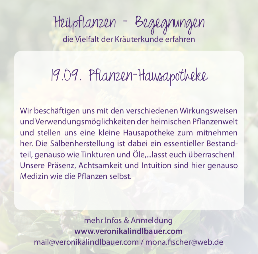 Nach und nach beschäftigen wir uns mit den verschiedenen Wirkungsweisen und Verwendungsmöglichkeiten und stellen uns eine kleine Hausapotheke zum mitnehmen her. Die Salbenherstellung ist dabei ein essentieller Bestandteil, genauso wie Tinkturen und Öle,...lasst euch überraschen! Unsere Präsenz, Achtsamkeit und Intuition sind hier genauso Medizin wie die Pflanzen selbst.